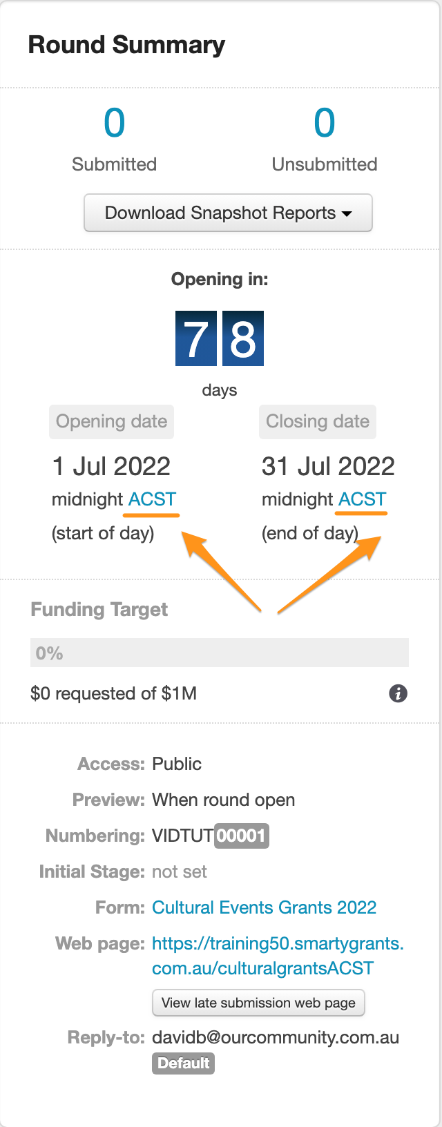 By default, one standard timezone (chosen when your account is created) is set for all of your rounds, for example AEST. If you would like the ability to set different timezones for rounds within your account, please contact the SmartyGrants support team to have this option enabled.