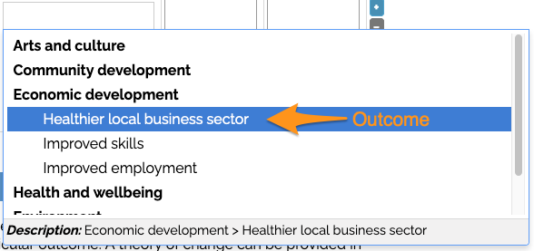 Outcome | Outcomes are the specific changes you hope will occur as a result of a program or initiative. They usually describe changes that you hope will occur in the lives of stakeholders. For example, the Domain 'personal wellbeing' might include physical Outcomes like 'reduced disease' or 'increased fitness', and psychological Outcomes like 'decreased anxiety' or 'improved confidence'. The Domain 'community connection' might include Outcomes such as 'improved sense of belonging' and 'a more vibrant community'. Your Outcomes should ideally indicate a direction of change – reduced; increased; decreased; improved; etc. If you don’t know what your intended program outcomes are, your guidelines are a good place to start. What is the primary purpose of your program? If it’s to provide capacity building support for local community groups, one of your Outcomes might be “Increased financial sustainability of local community groups”. It is also a good idea to identify who ('target group') is going to benefit in the outcome statement i.e. young people in North Dandenong, children 3-5 attending kinder programs, women attending the health program. You must include at least one Outcome in your Framework, and you may include as many as you like (though less is more; the more Outcomes you try to track, the less likely it is that you will be able to make sense of it all). Use a new row for each Outcome. You may provide a Description and Keyword/s for each Outcome in columns F and G (see below for more information on these fields). |