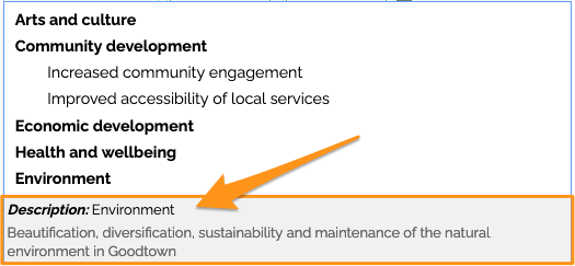 Description | In this column you may add a Description for any Domains, Outcomes or Metrics that appear in Columns A, B or C in the corresponding row. The Description you provide here will provide further context for people filling in the form (as shown below). |