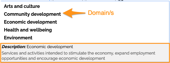 Domain | A Domain is a heading or category for a group of Outcomes. Grouping Outcomes into categories or themes can make it easier for you to find and report on similar outcomes; for example, you can filter by Domain in your Outcomes Engine report. Your Domains should describe the arenas in which change is going to occur for your stakeholders – e.g. ‘Arts and culture,’ ‘Community development’ and ‘Economic development’. This is a non-compulsory field in SmartyGrants. Only use this field if it makes sense in the context of your program. For example, if you have just a few outcomes, you probably don’t need to use Domains to sort them into categories. Domains appear on forms as unselectable headings. By default Domains are visible to those filling out a form, however, this can be adjusted under display options within the form. You may provide a Description and Keyword/s for each Domain in columns F and G (see below for more information on these fields). |