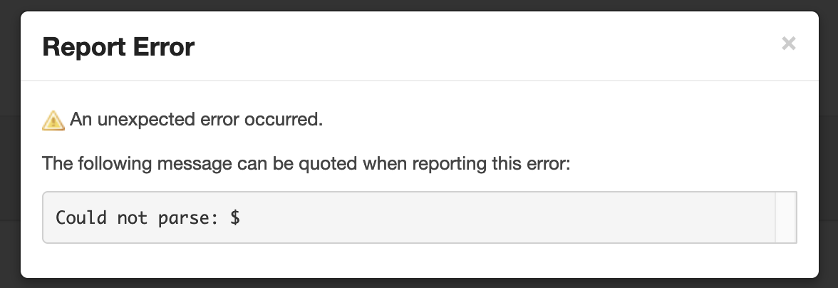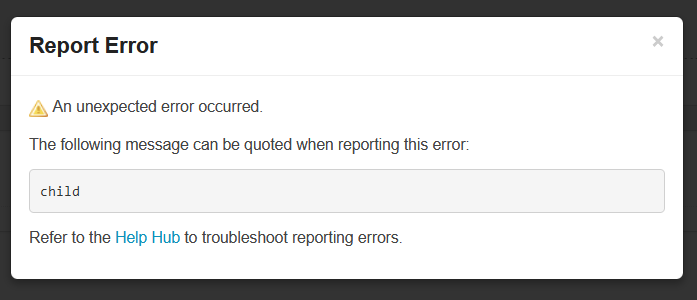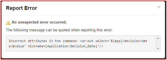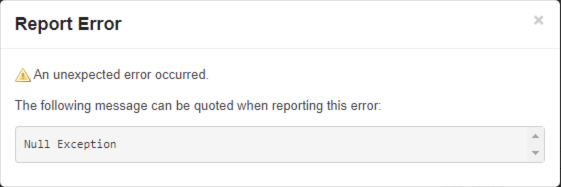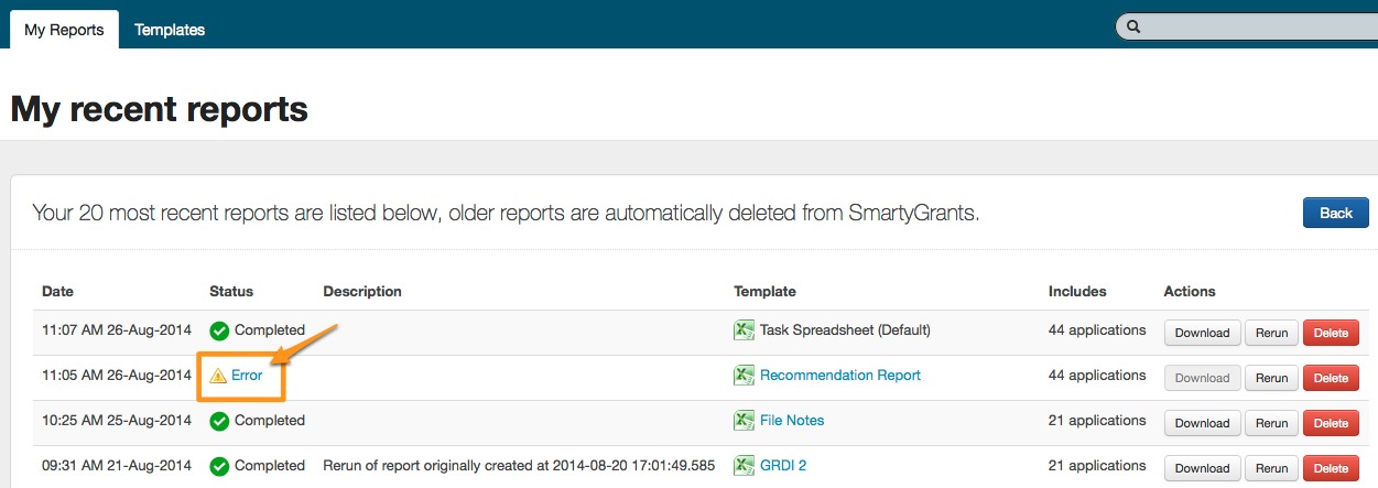 This means that an unexpected error has occurred. | In this instance you are best to e-mail the service team with: a) a link to the report template (e.g., manage.smartygrants.com.au/reports/template/XXXXXX/edit); and b) a link to an application to run the report with (e.g., manage.smartygrants.com.au/application/XXXXXXX/application). | |