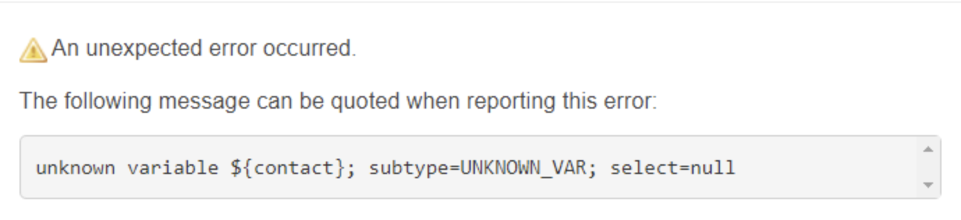This error occurs because of a missing 'contact' start tag | To fix this, you will need to add the start tag (i.e. <wr:forEach select='/report/contact' var='contact'>) to your reporting template. | |
