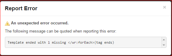 This error occurs because there is a missing end tag. | To fix this, you will need to add an end tag (i.e., </wr:forEach>) to your reporting template. | |