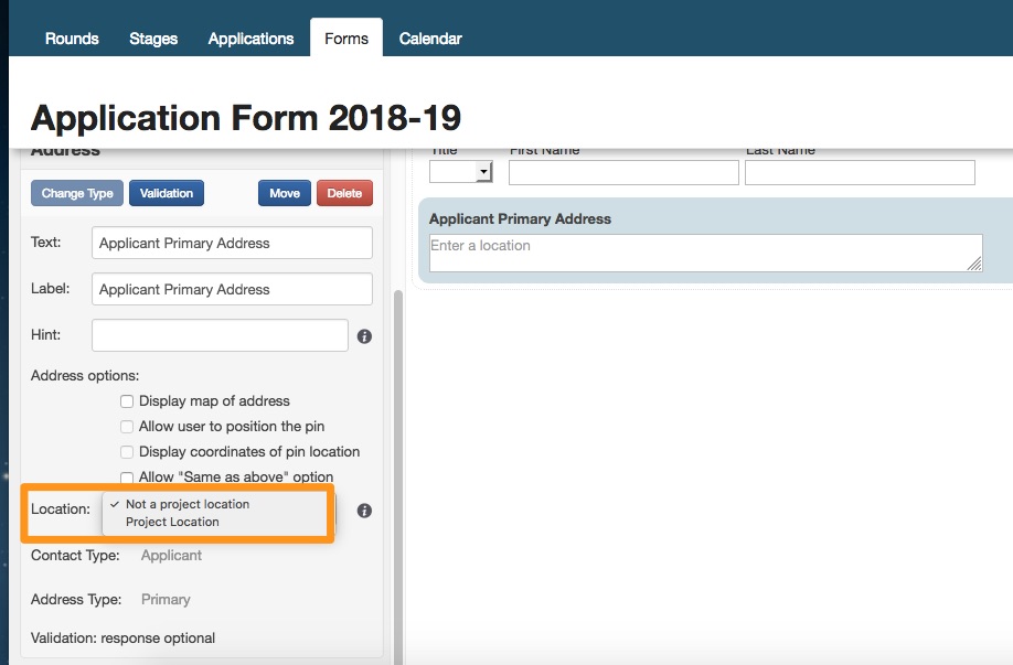 Project location is an option that can be selected on any address in a form. No matter how you chose to add this address to the form you have the ability to specify if this address is a project location or not is the side panel.
