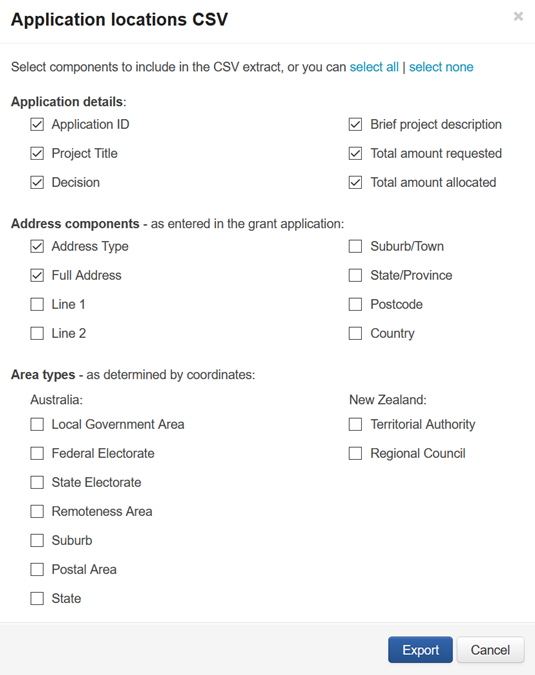 When downloading the Application locations CSV, you can customise the level of detail required in the extract from data points on the map based on: