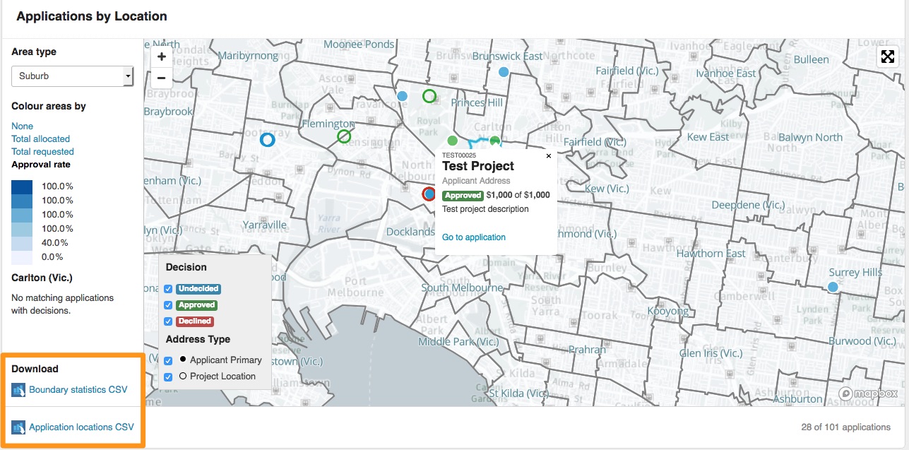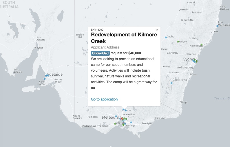 Maps can display undecided, approved or declined applications, along with clickable popup displays of total amount requested, project title etc...