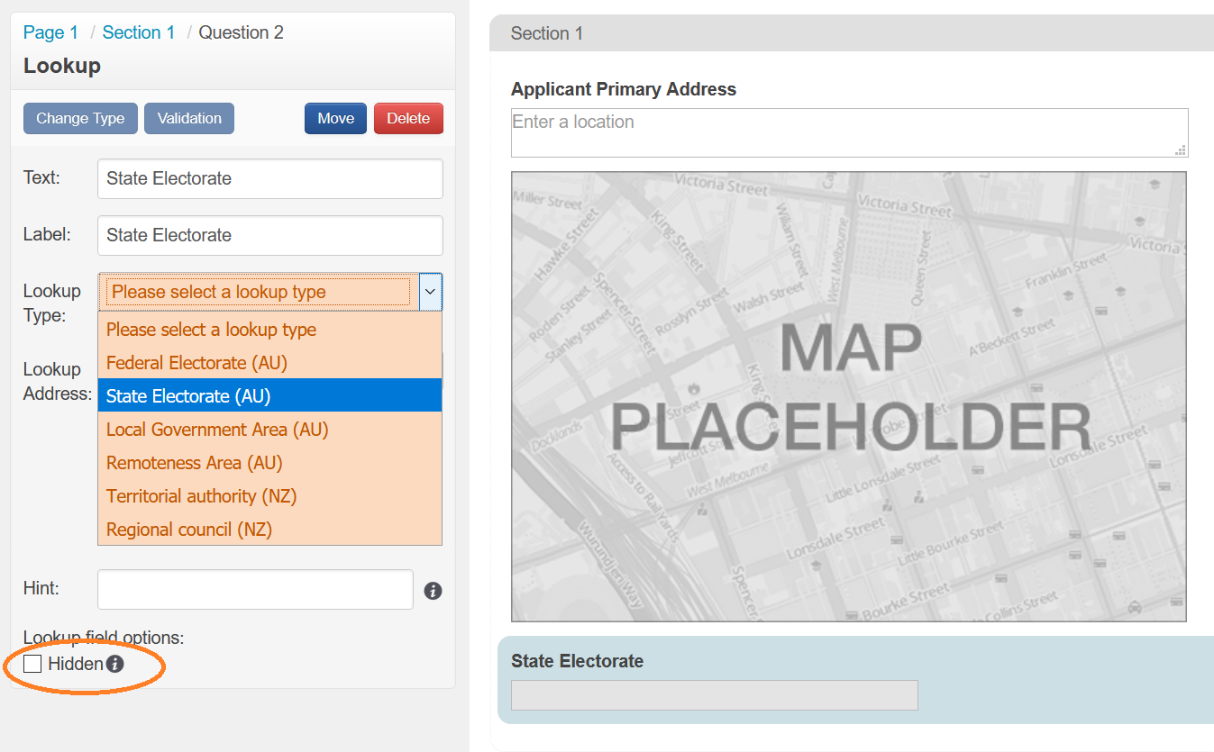 Along with the ability to map you can also Lookup electorate information State & Federal plus Local Government Areas and Remoteness Area. These fields though added to a form do not have to be displayed - these fields can remain hidden if specified.
