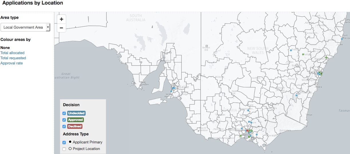 Each grant application shown as a dot on the map (green for Approved, Red for Declined, blue for Undecided)