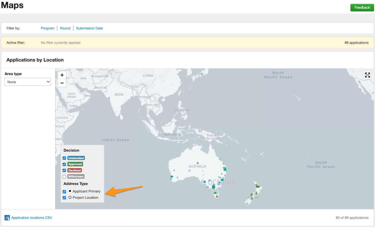 There are 2 types of addresses that will appear on the map; an Applicant Primary Address and any other address that you specify as being a Project Location. Project Locations are displayed as points on the map, but aren't counted in any boundary statistics.