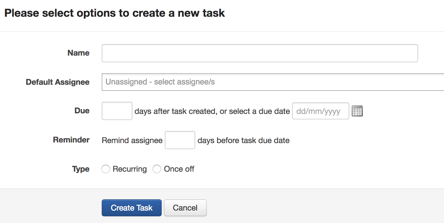 Note: You can only create once-off tasks via the tasks icon. To create recurring templates, you will need to click into the workflow tab of the relevant program.
