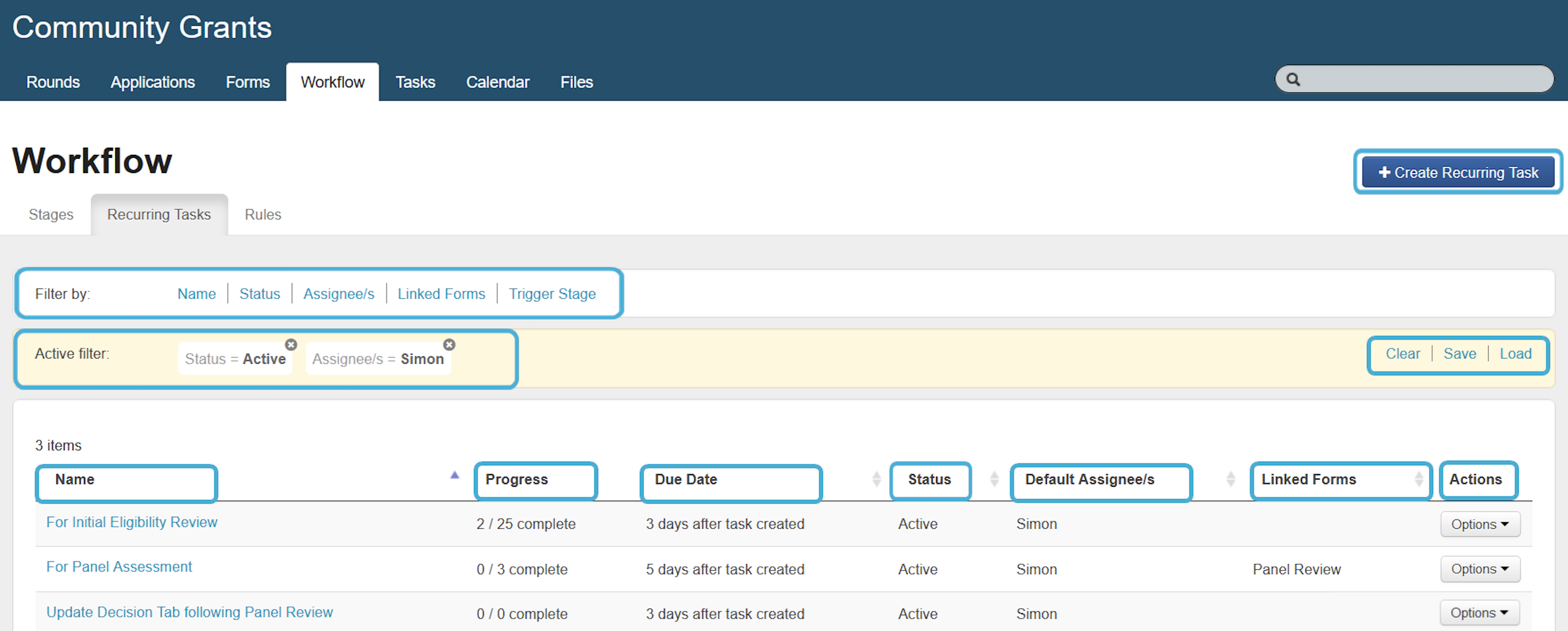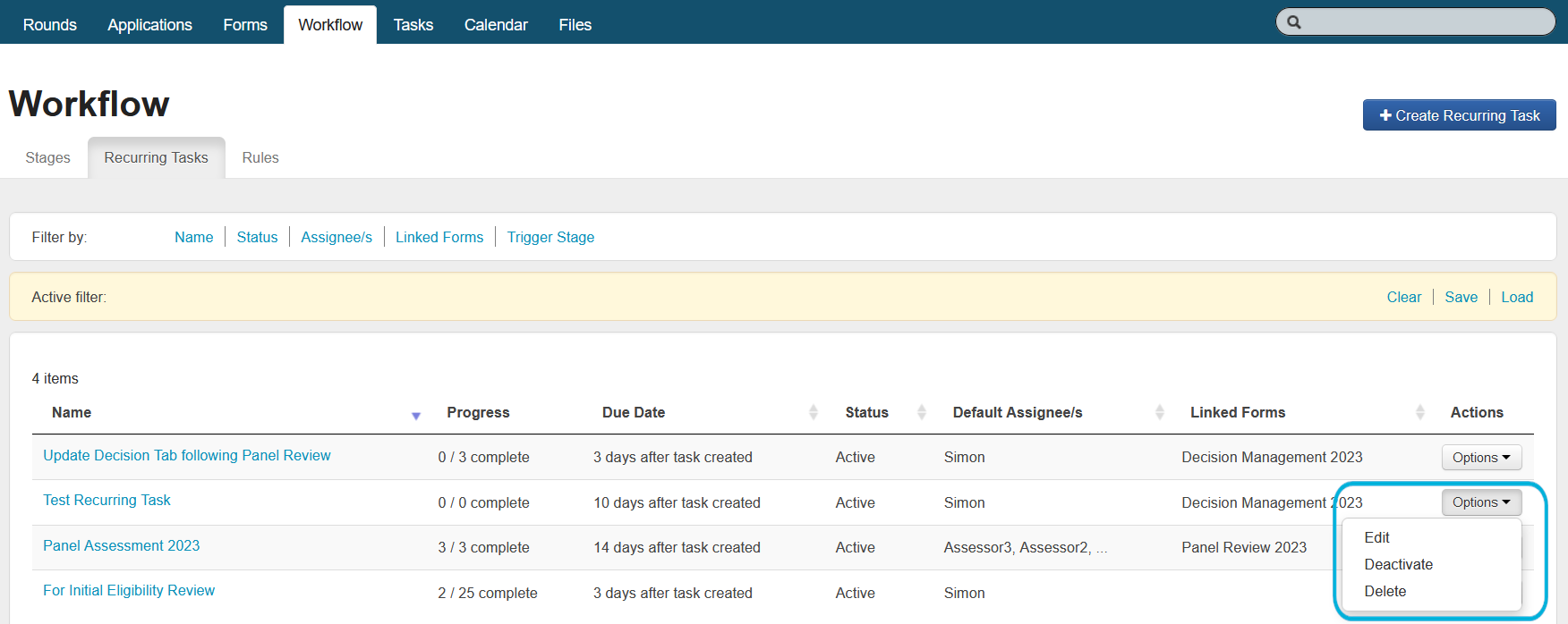 Recurring tasks are an important component of workflow throughout the grantmaking lifecycle. A recurring task is a task that is created and assigned on the occurrence of an event in the system. For example, an application entering a particular stage, or a form being submitted.