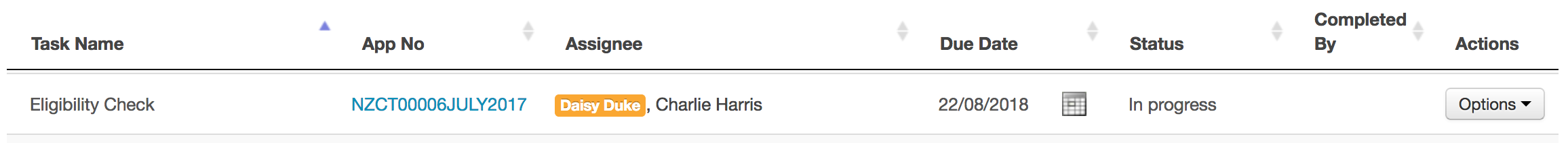 If any one of the assigned users can complete the task, then a single task is created that can be completed by any one of the assignees. This option will show all assignees listed against the task, and if an assignee marks the task in progress or begins filling in a linked task form, that assignee will be highlighted on the task. This means that the other assignees know the task is already under way. In the image below, Daisy Duke has marked the Eligibility Check task as "In Progress" (by opening the linked form, or manually depending on the task settings), which is why her name has been highlighted in orange.