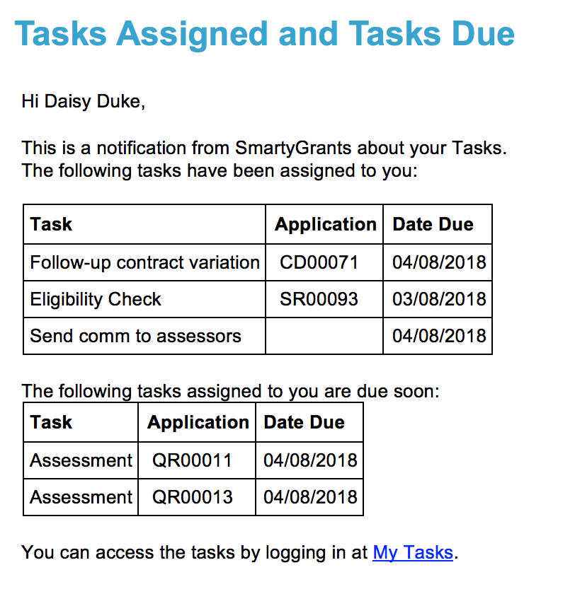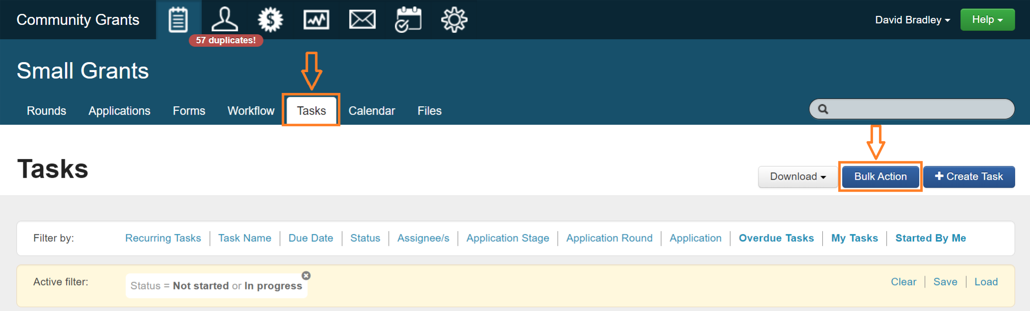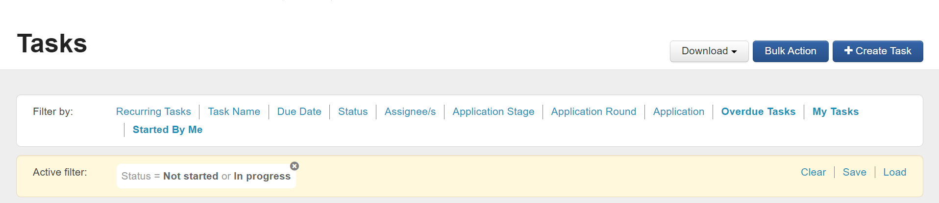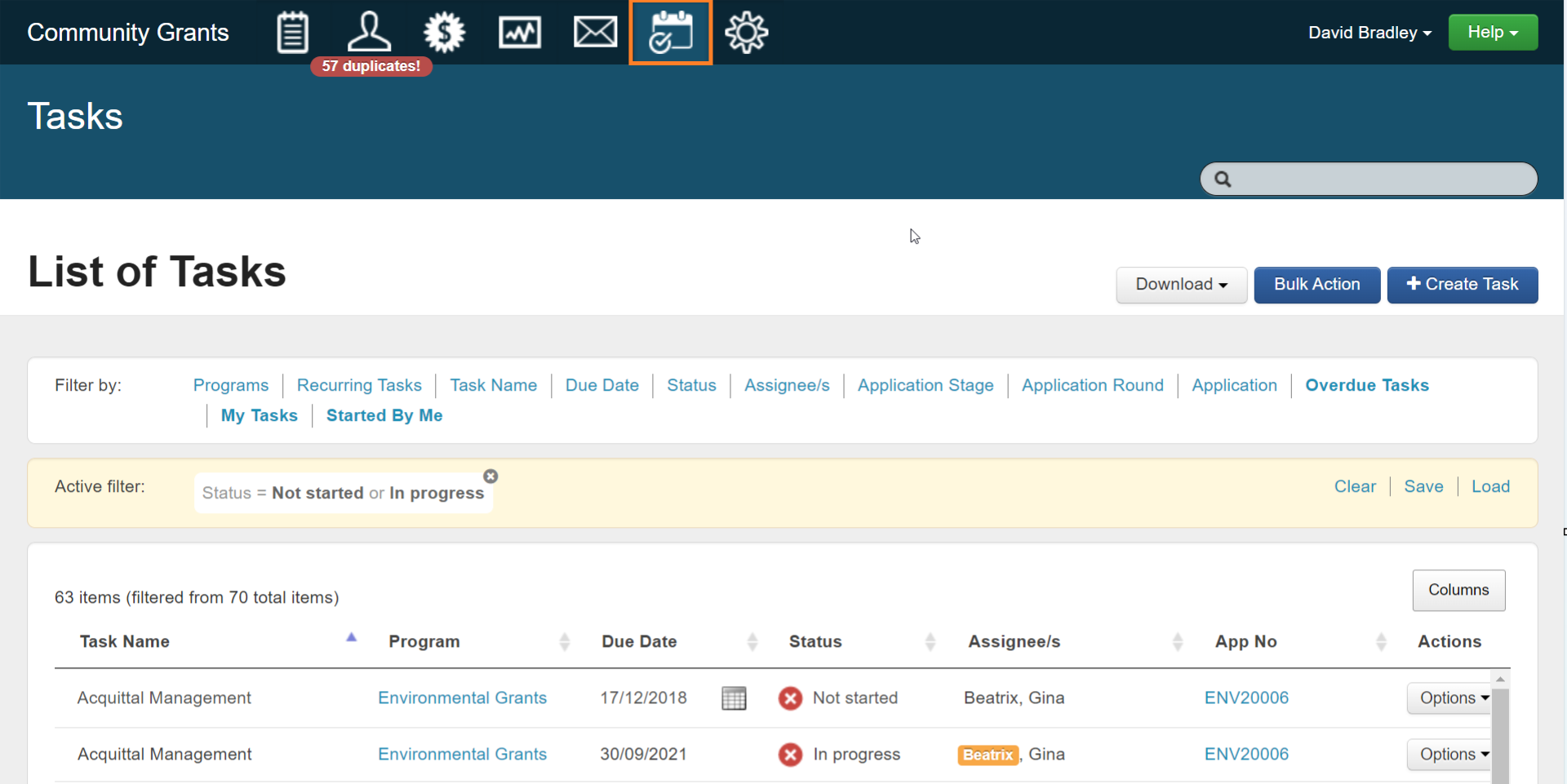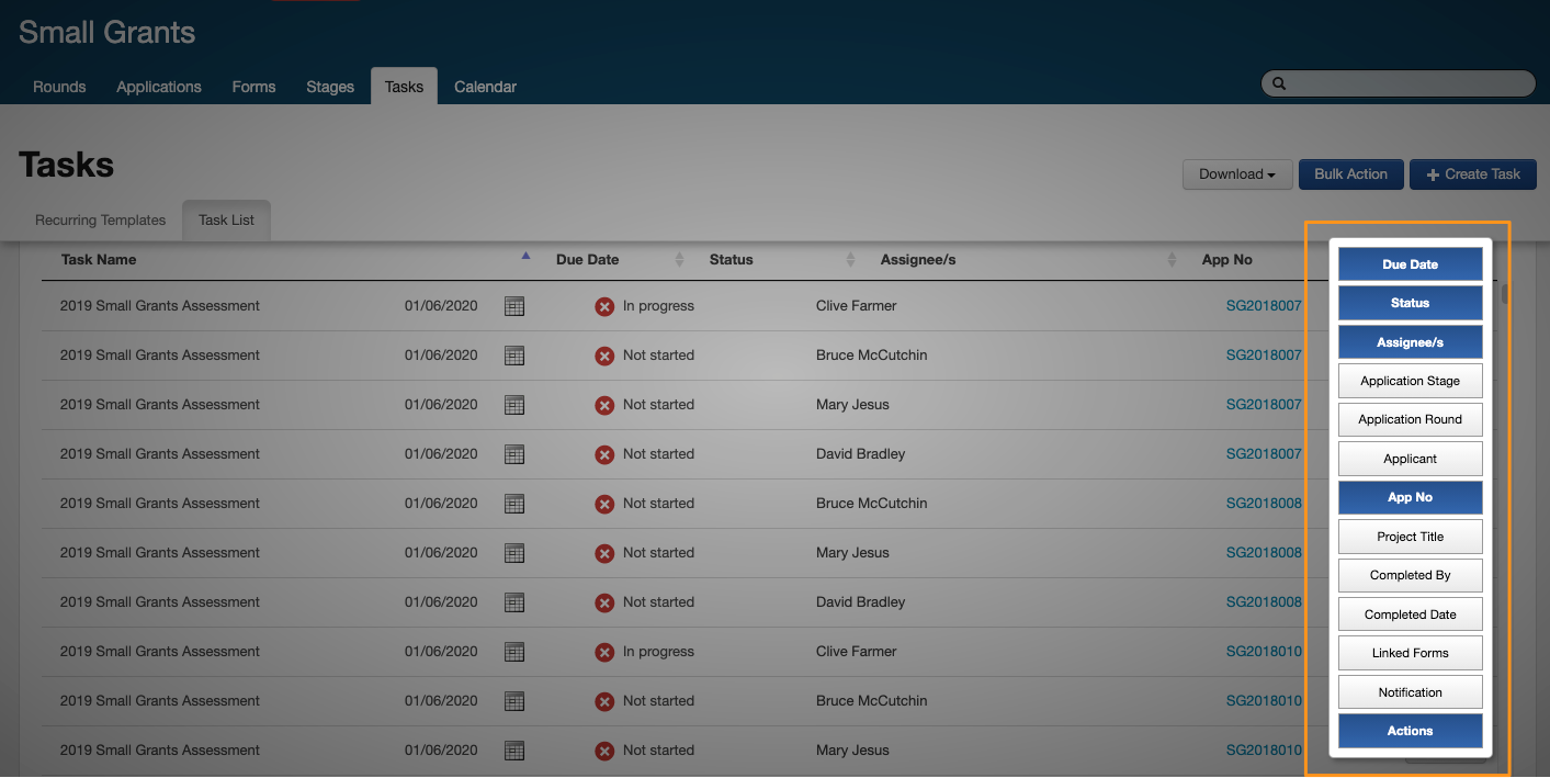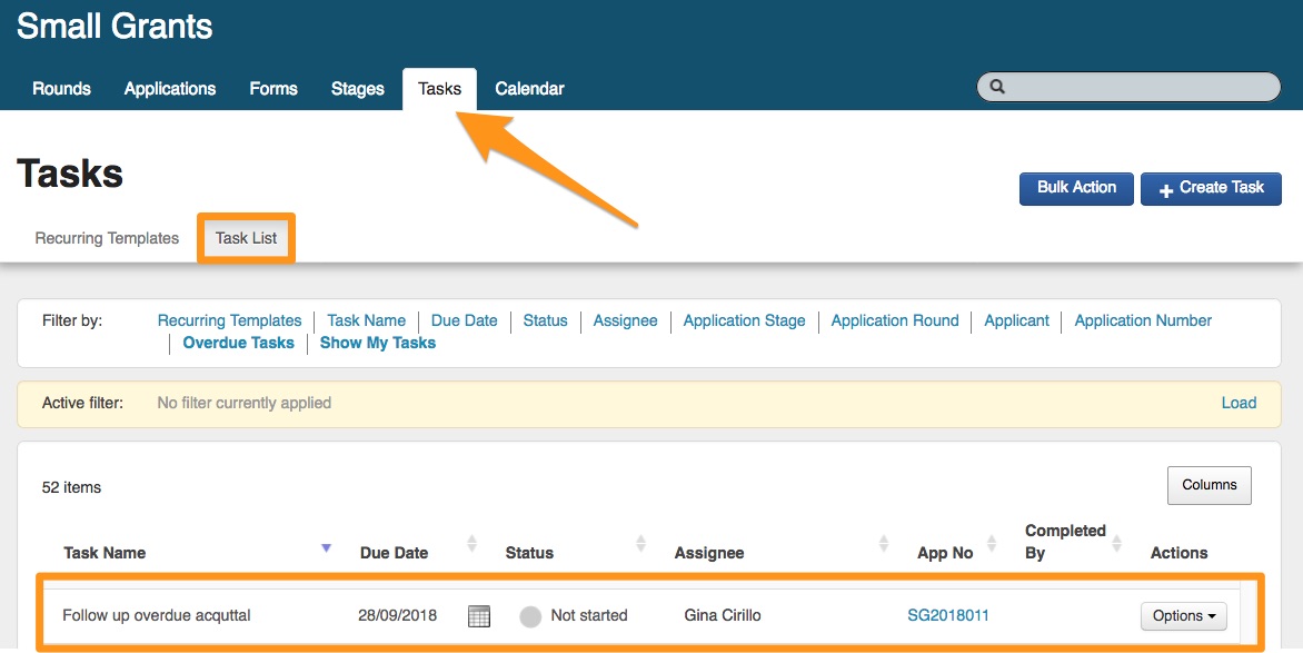 Tasks have been designed to help manage your grants process. They are a useful way of ensuring you and your team are completing all necessary actions within your grants cycle. Tasks can be assigned to individuals or multiple users. You can also set a 'trigger' which will decide when a task will be applied.
