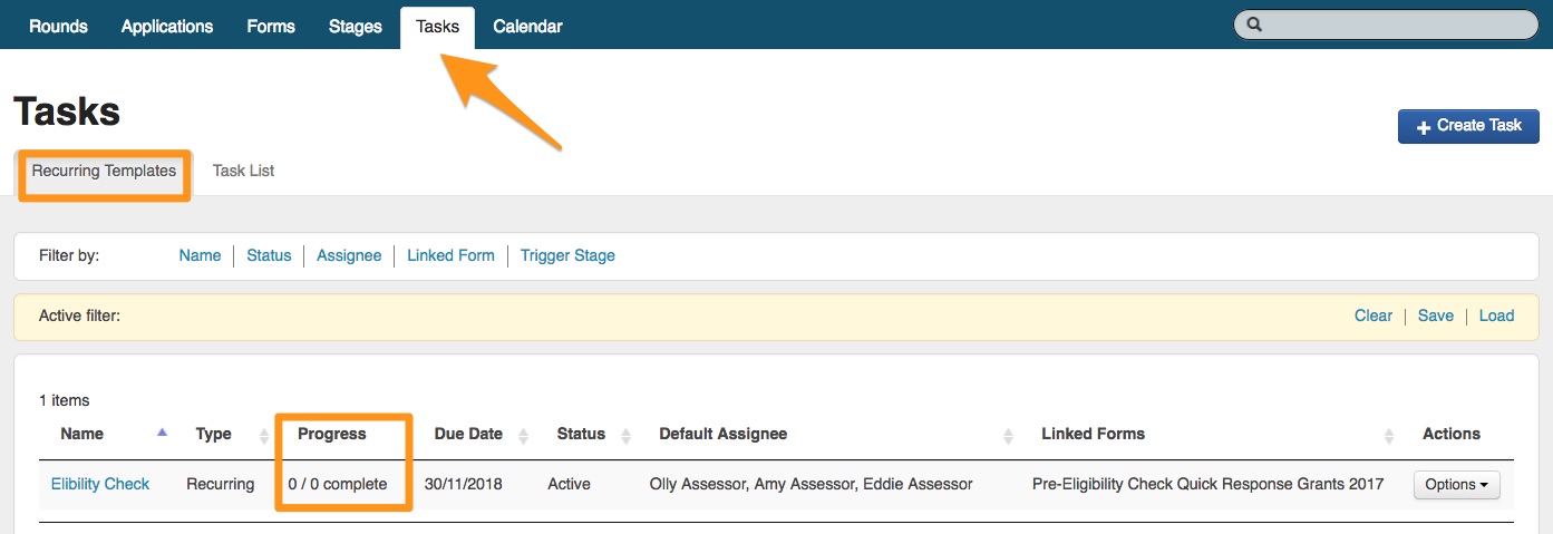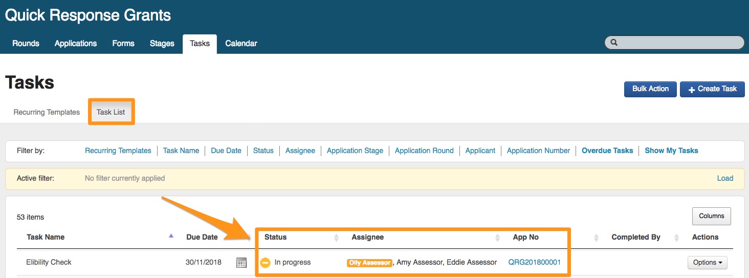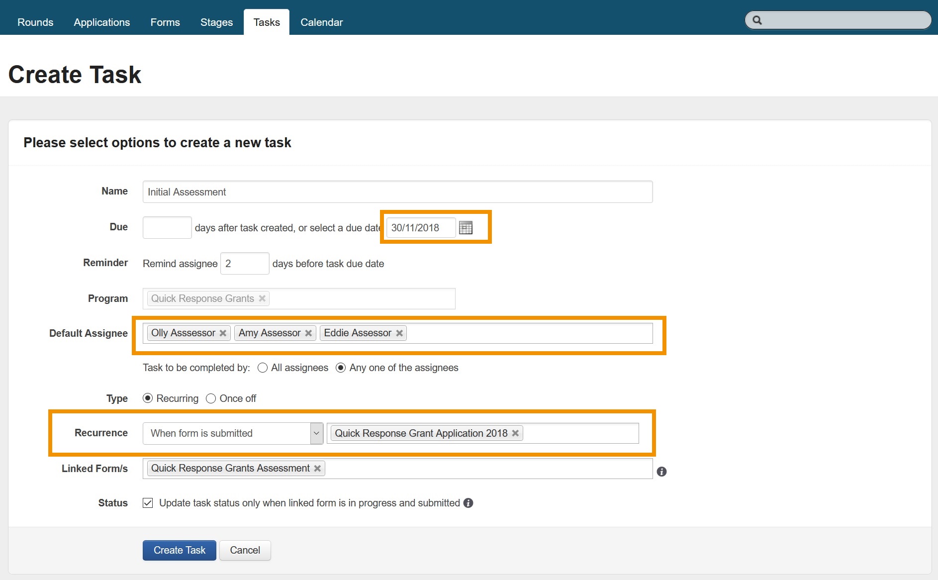 In this scenario, my process is such that all newly submitted applications must be checked by the internal assessment team for eligibility. From the Tasks tab I have created a recurring task to be completed by any one of the three assessors. This task is triggered when the 'Quick response Grant Applications' are submitted. Either Eddie, Amy or Olly will be required to complete this eligibility task (using a form that I have linked to the task) by 30 November 2018. Once Eddie, Amy or Olly commence this task 'In progress' will display with the person's name highlighted so each Assessor knows who is working on that Task.
