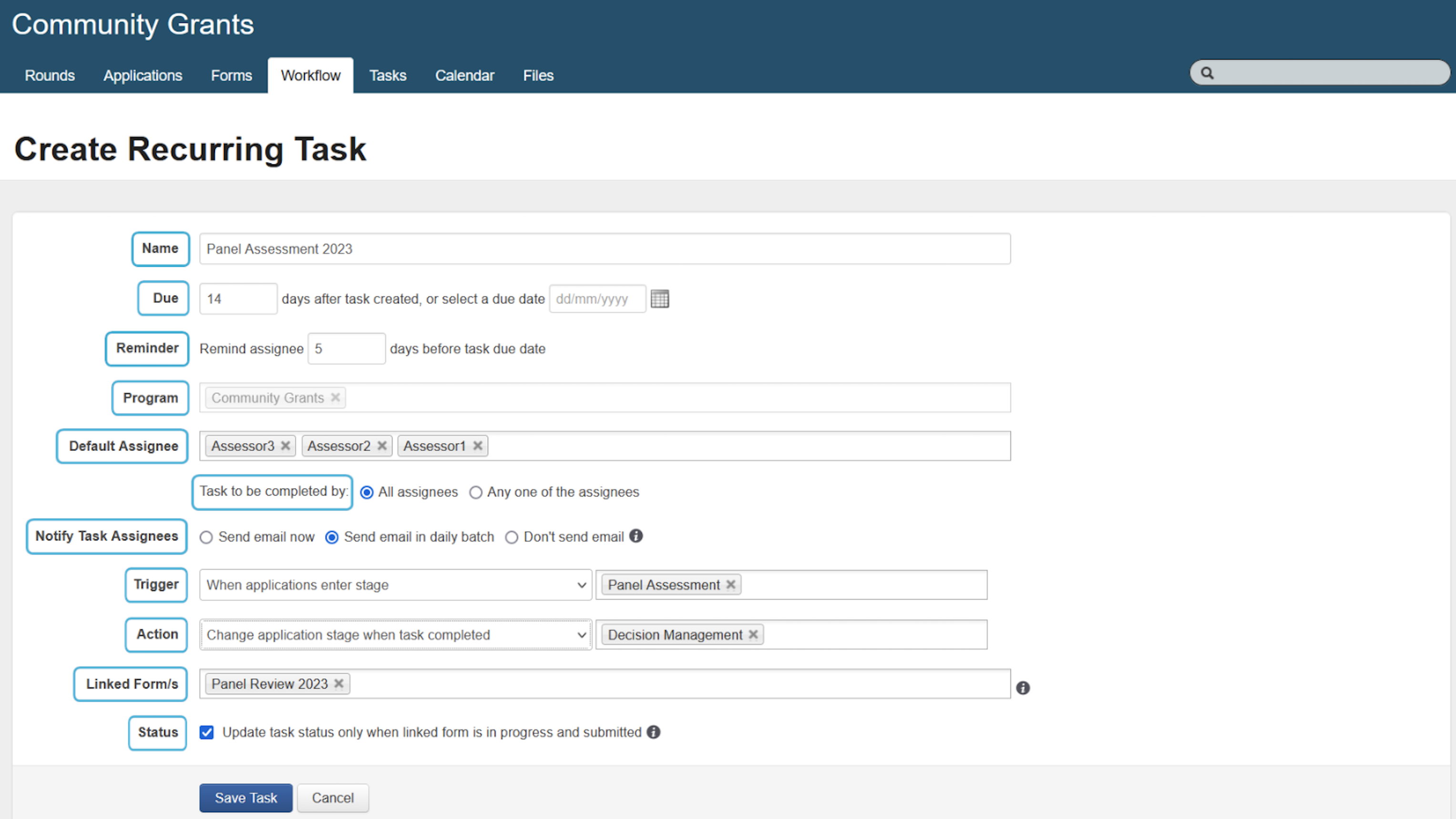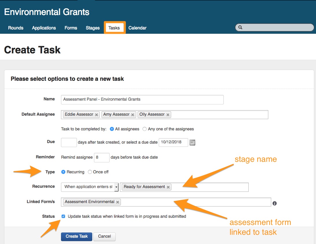 Panel Assessment example: In this example I have created an Assessment Panel task with 3 assessors assigned to the task. In this scenario I need all 3 assessors to complete this task. I will specify that I want the Task to be completed by the 10/12/2018 and I want the assessors to be reminded by email 8 days prior to that date. This will be a recurring task and I want this task to be triggered anytime an application enters the stage called " Ready for Assessment". I also want the assessment form to be linked to this task, so that the assessors all complete their version of the same form and I want the task status to be automatically updated when the assessor begins using the form and when the form is submitted.