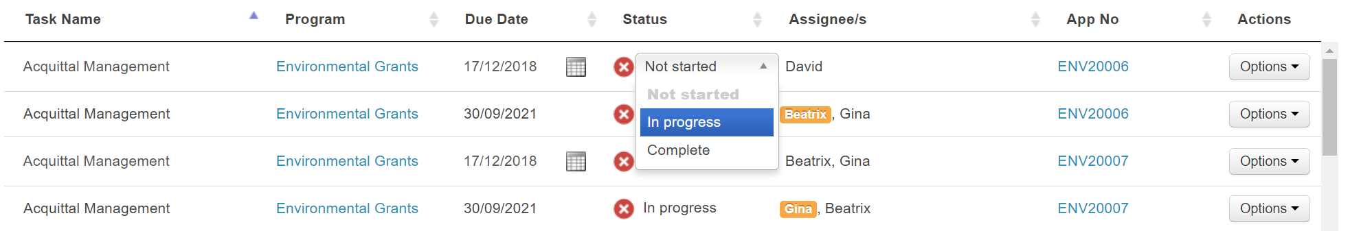 Whilst on the application, you can change the task status, edit and view details by clicking on the drop arrow next to the task.