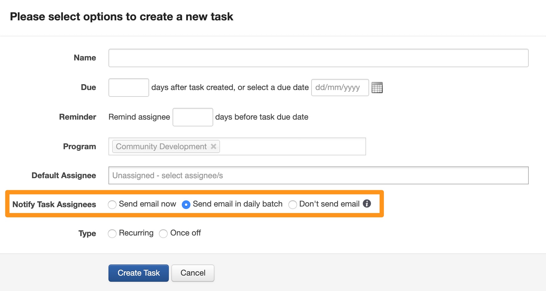 Notify Task Assignees: there are three options available for task notification emails. Note that emails are sent when the task is created or the assignee on the task is changed, not when the recurring task is created: