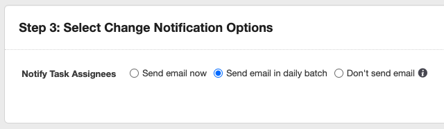 Send email in daily batch: will include the task assignment in the batch email, which is sent automatically every day at 5:00am Australian Eastern Time.