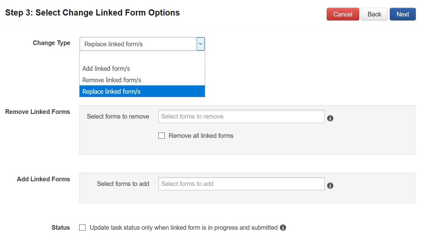 6. Change Linked Form: you can add, remove, or replace linked forms in bulk. Replacing a form may be useful when a change has been made to the form. Note that forms already added by an assignee will not be removed/replaced