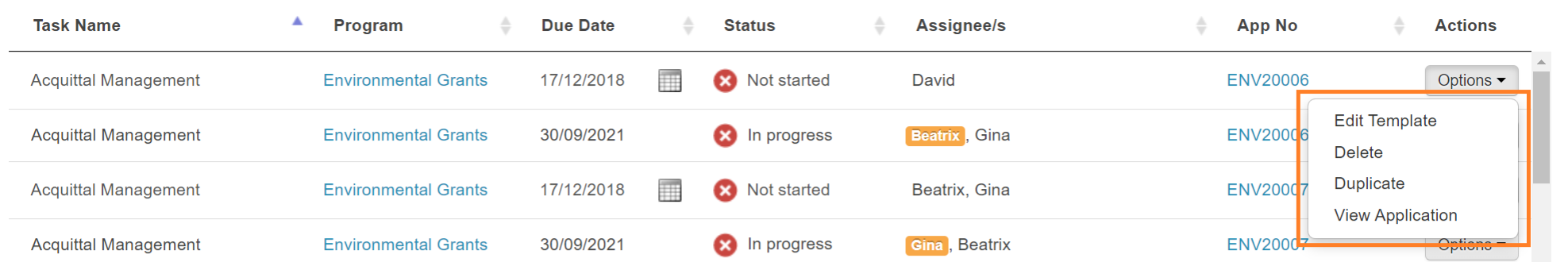 Select the options button on each task to delete, view or edit the relevant recurring template (if applicable) and you can view a linked application if relevant.