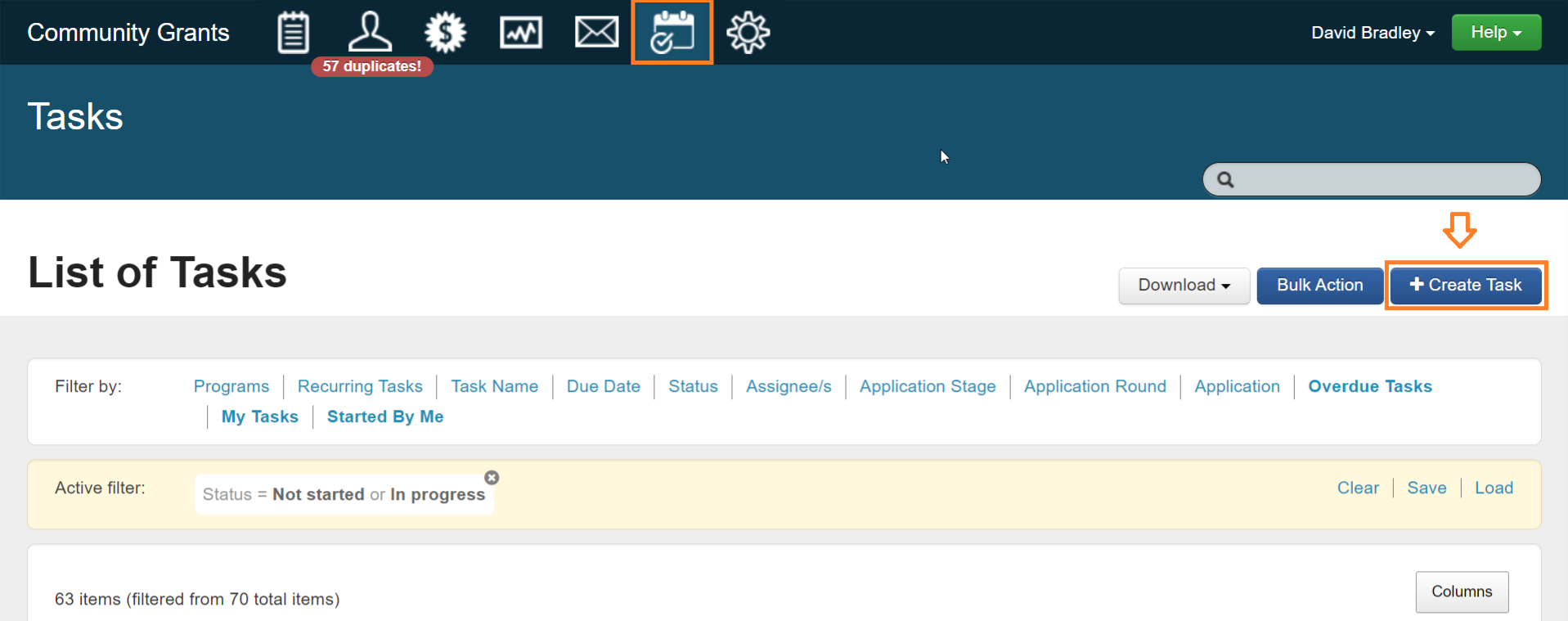 The tasks icon allows you to manage tasks across multiple programs by viewing tasks across different programs or filtering by tasks that are assigned to you. This will give you quick access to view, edit and access tasks. You can also create once-off tasks from this icon.