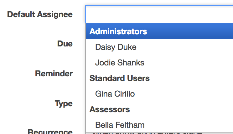 Tasks can be assigned to one or more users. When selecting the user/s to assign to the Task, they are grouped within the drop down by User Access Type: