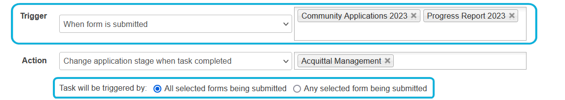 Task will be triggered by: appears when you have selected more than one form. Options available are: