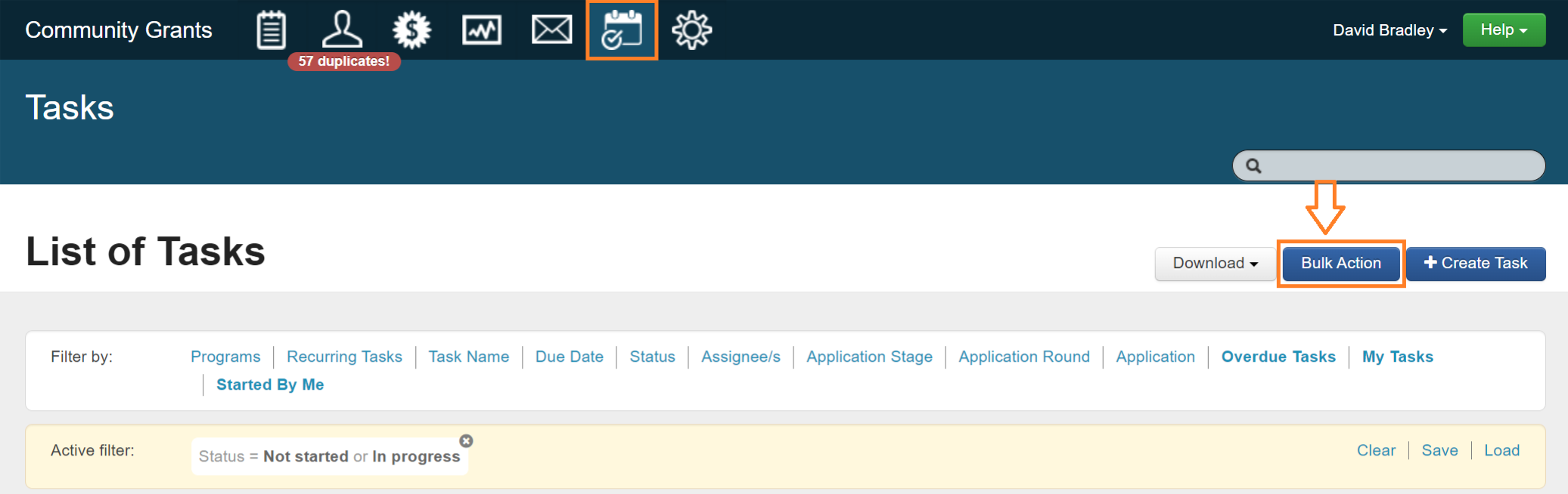 You can manage tasks via bulk actions in the Tasks Icon, or via the task list tab of a specific program.