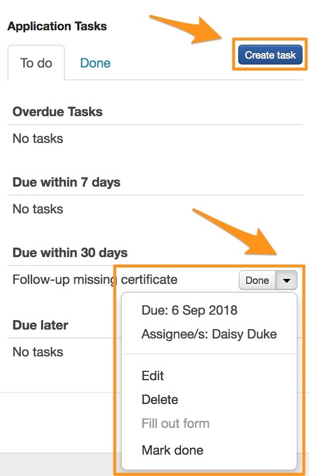 Once off tasks: will appear on the 'task list' tab (and if applicable to an application, also when viewing an application).