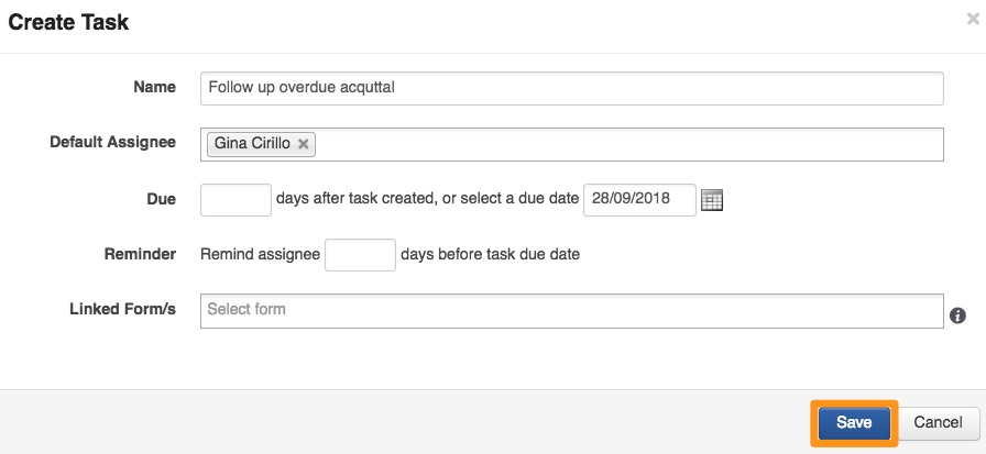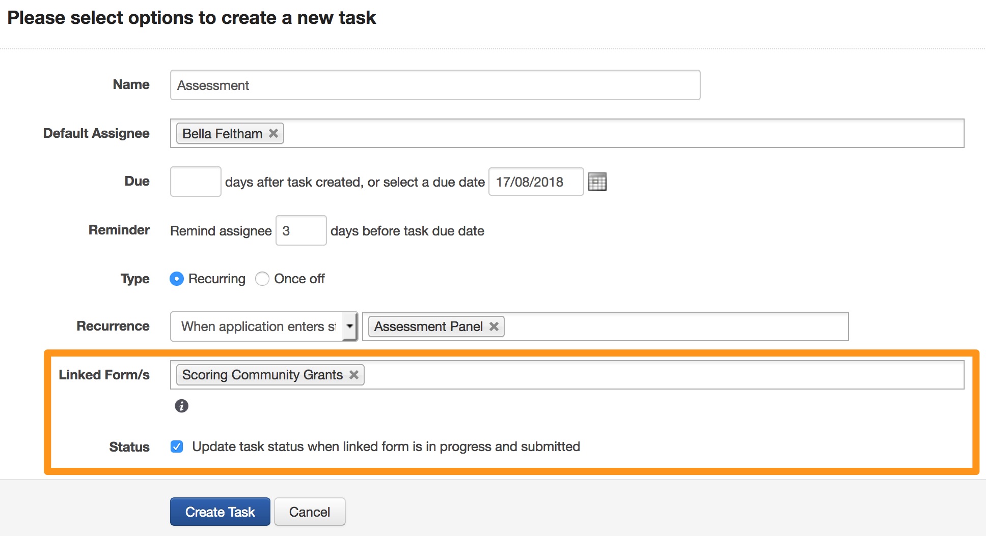 By default, the status of the task will be updated when the linked form is in progress or submitted. This means that when the assignee adds the form and saves it, the status of the task will update to "in progress". Once they have submitted the form, the task will automatically be updated to a "complete" status. You are able to deselect this option when creating the task should you wish the status to only be manually updated.