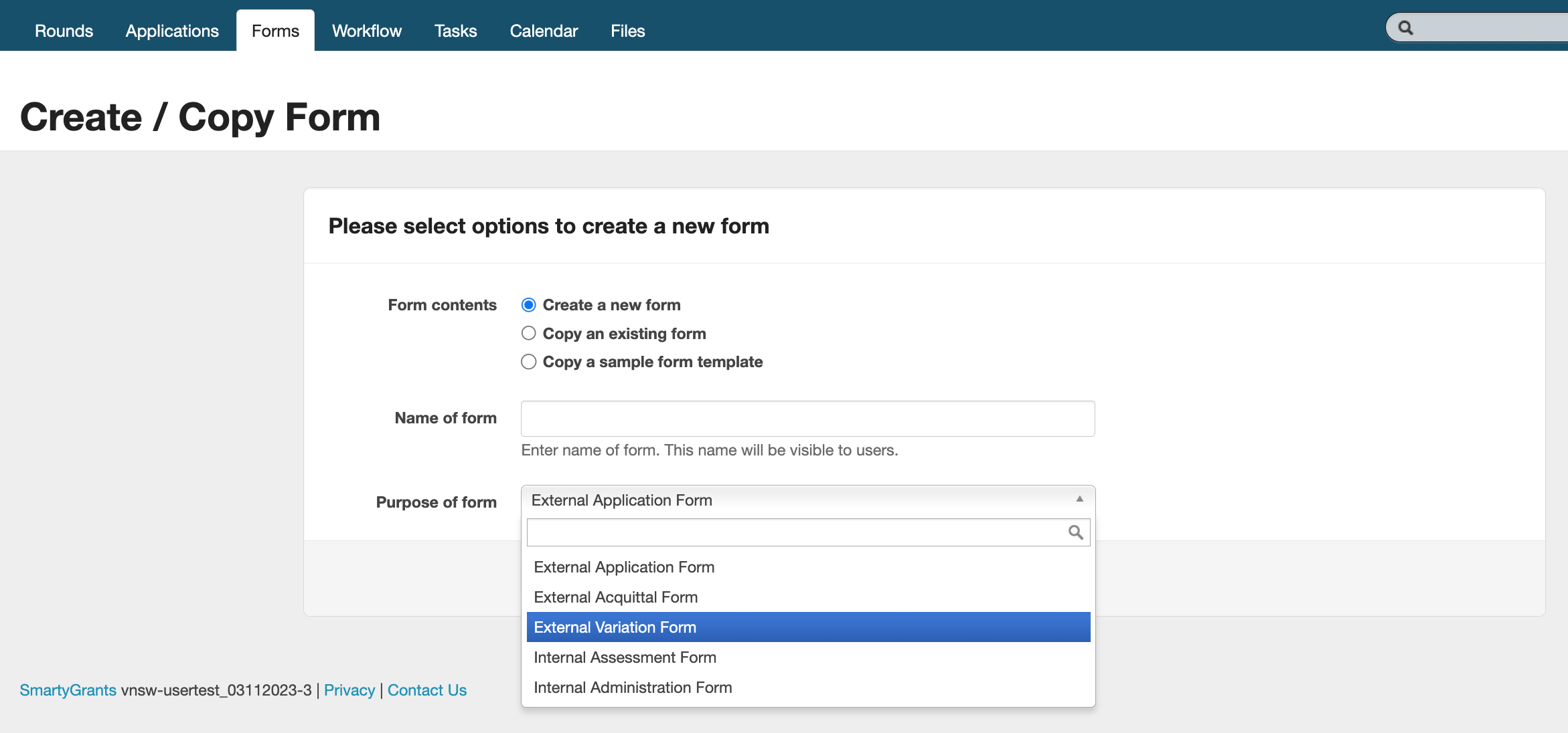Tip: When creating each variation form, ensure you select the relevant 'Purpose of form' (External Variation Form / Internal Assessment Form / Internal Administration Form), so that they appear in the correct tab of the application, and also so that the applicant can see the External Variation Form.