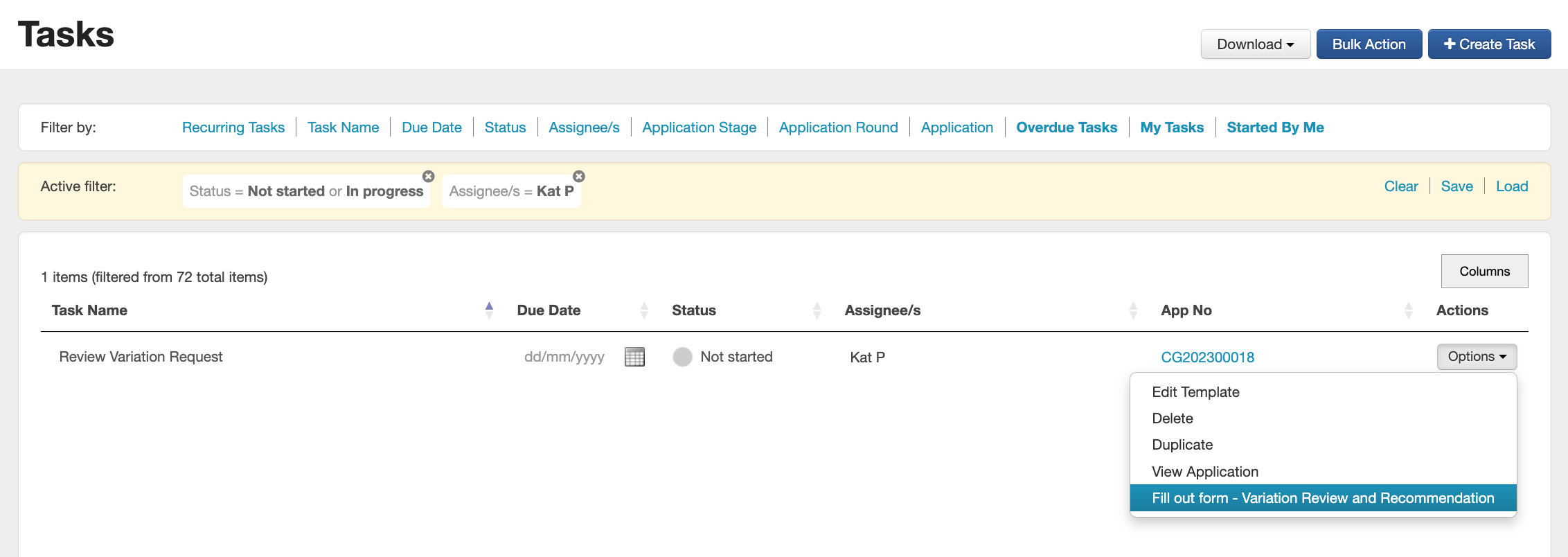 Tip: The action of adding a variation form to applications can be done in bulk (more than one application at a time). See Bulk Action Options for more information.
