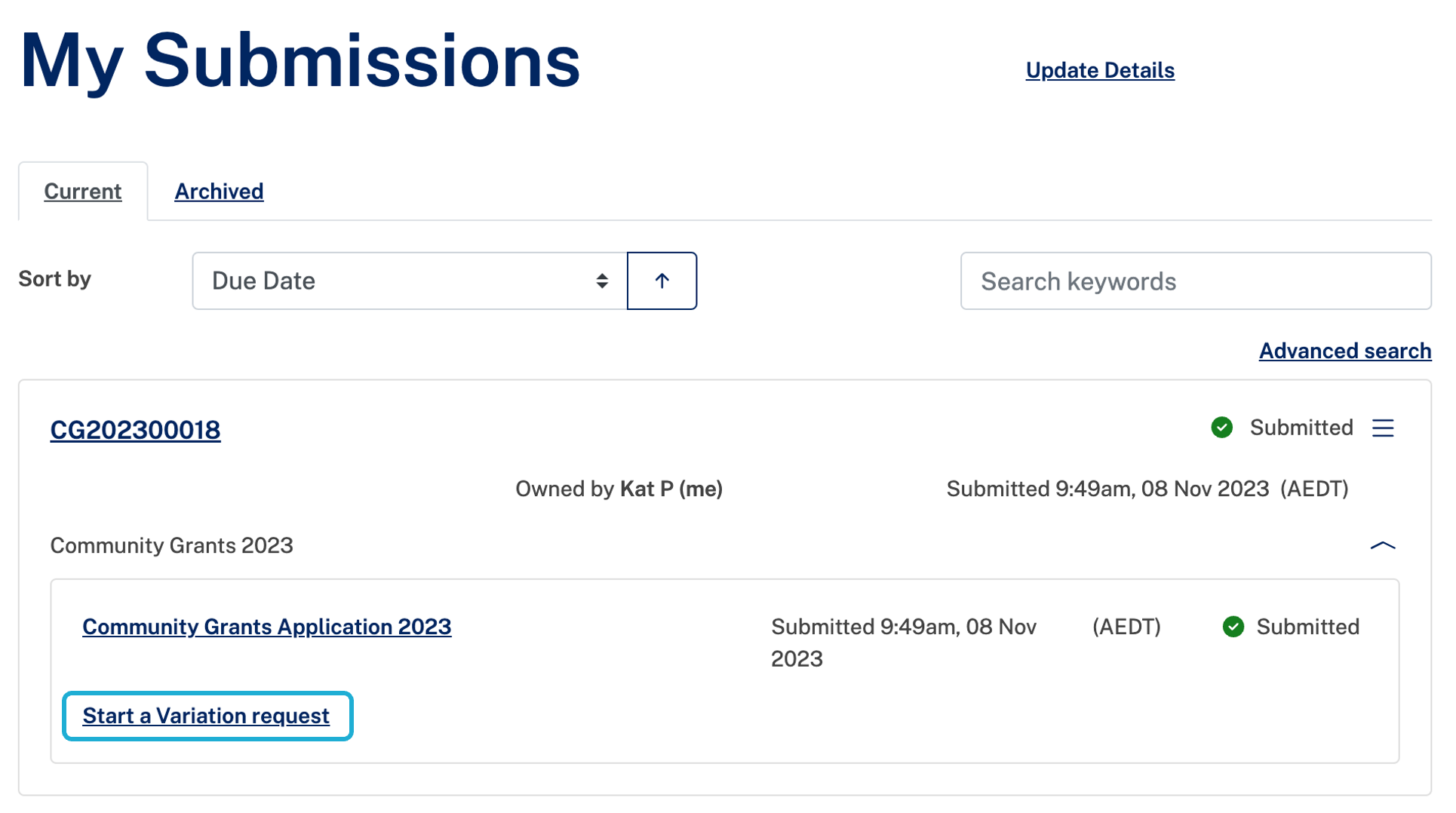 When the applicant logs in and navigates to their My Submissions page, they will see a new variation form attached to their existing application. The system will prompt them to confirm once they select Start Variation Request Form. The applicant would fill out the form just as they would a regular application form.