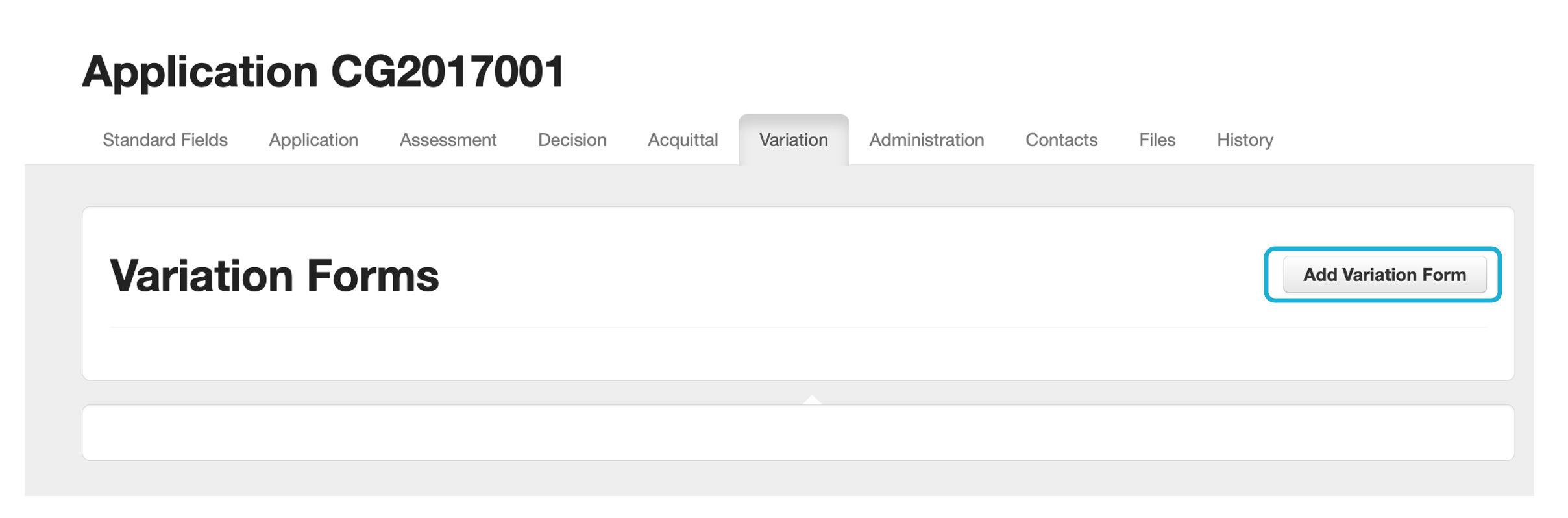 Variation forms are a specific form type in the system. They are an external form, meaning they are filled out by the applicant rather than by an internal program manager. When a variation-type form is attached to an application, it sits under the application’s Variation tab. Below is an example application with a Variation Request form that has not yet been submitted by the applicant, and is awaiting their action.