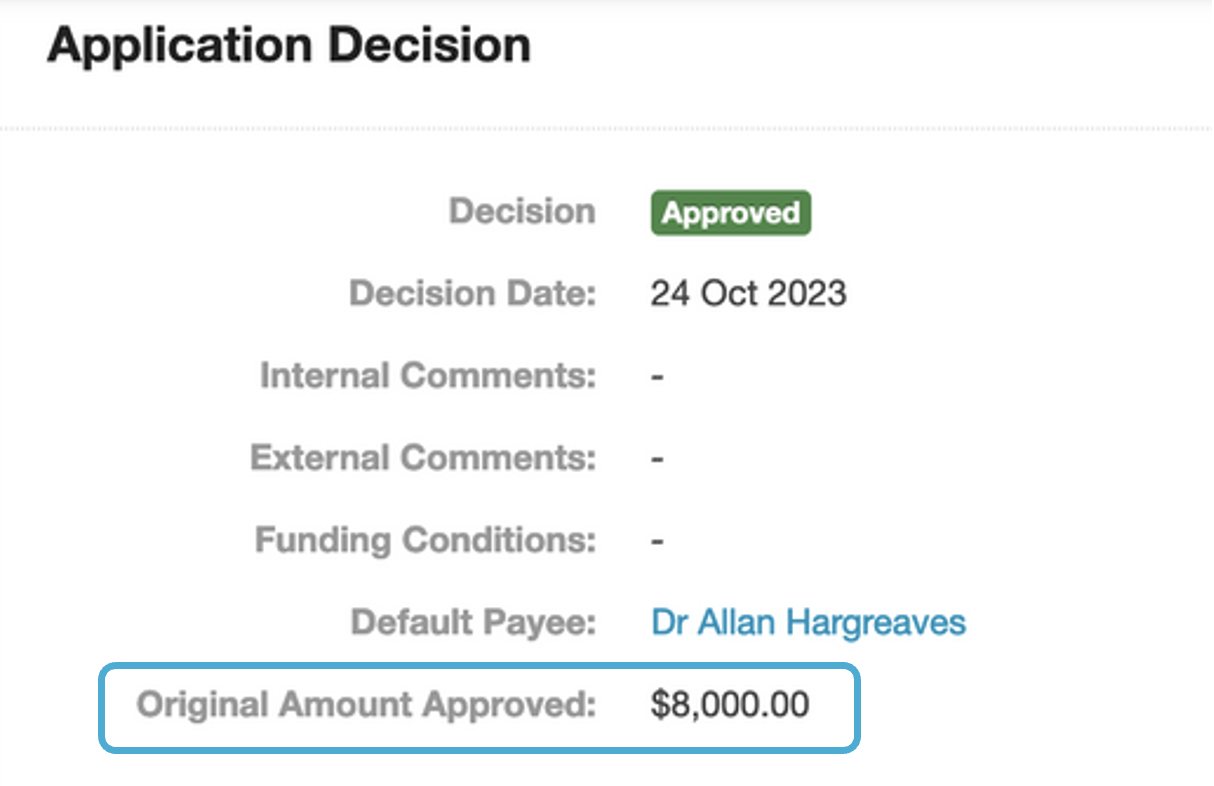 To assist with managing variations, an Original Amount Approved field is available in the Decision tab that can be updated when recording funding changes related to funding.